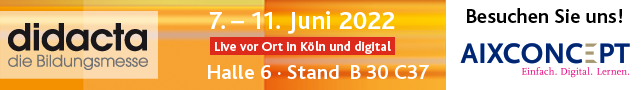 AixConcept auf der didacta: 31 Programmpunkte an fünf Tagen, vier Podiumsgespräche mit den Vertreter*innen der großen Lehrkräfte-Verbände GEW, VBE, VDR und des Philologenverbandes sowie zahlreiche Gelegenheiten, mit Anwendern und Anwenderinnen der MNSpro Cloud aus Schule und Verwaltung ins Gespräch zu kommen: Der führende Anbieter von Schul-IT-Dienstleistungen in Deutschland AixConcept lädt vom 7. bis 11. Juni 2022 mit einem vielfältigen und vor allem praxisnahen Angebot zur didacta nach Köln. Das komplette Programm finden Sie unter www.aixconcept.de/didacta